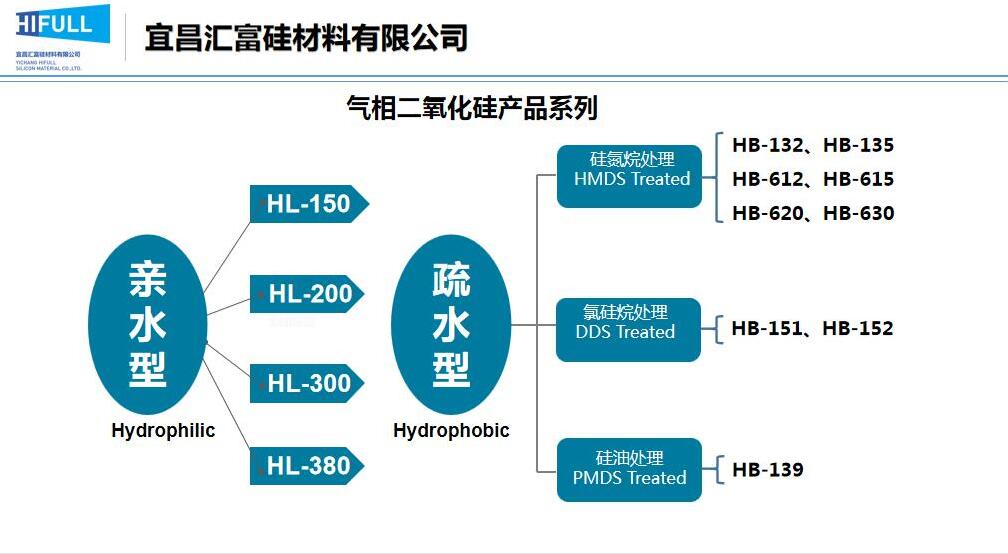 宜昌匯富硅材料有限公司是一家專業從事氣相二氧化硅(俗稱氣相法白炭黑)研發、生產和銷售的國家級高新技術企業。公司在氣相二氧化硅行業具有二十年技術沉淀,主導制定了ISO18473-3:2018《硅橡膠用氣相二氧化硅》國際標準和GB/T20020《氣相二氧化硅》國家標準。公司擁有HL-150、HL-200、HL-300、HL-380系列親水型氣相二氧化硅和HB-612、HB-151、HB-139D等九種牌號的疏水型氣相二氧化硅兩大系列產品,在產能與深加工處理技術等方面處于優勢地位。