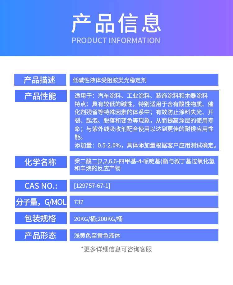 RIASORB UV123具有較低的堿性,特別適用于含有酸性物質(zhì)、催化劑殘留等特殊因素的體系中;有效防止涂料失光、開裂、起泡、脫落和變色等現(xiàn)象,從而提高涂層的使用壽命;與紫外線吸收劑配合使用以達到更佳的耐候應(yīng)用性能。