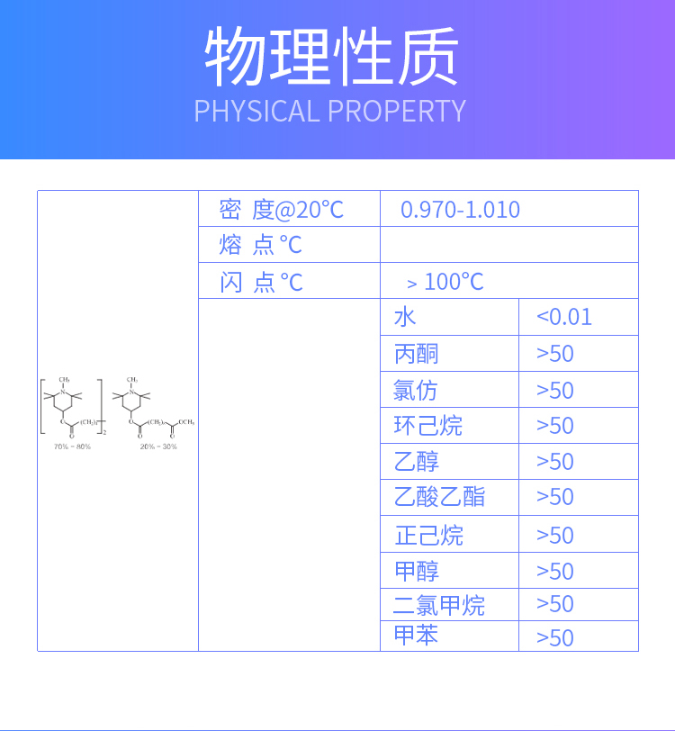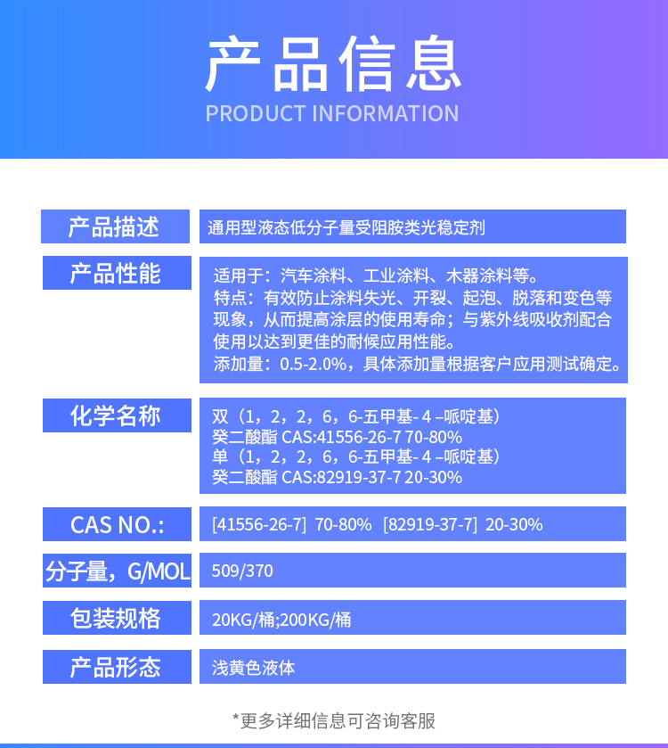 有效防止涂料失光、開裂、起泡、脫落和變色等現(xiàn)象,從而提高涂層的使用壽命;與紫外線吸收劑配合使用以達(dá)到更佳的耐候應(yīng)用性能。